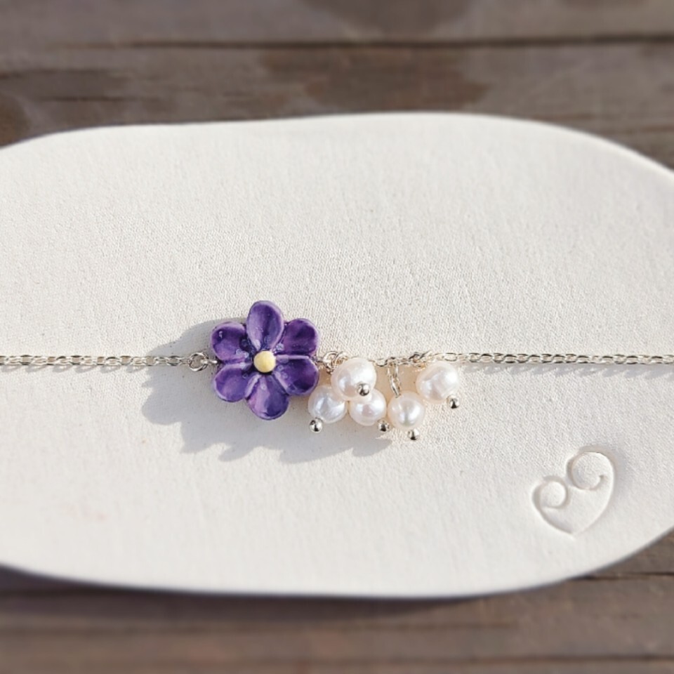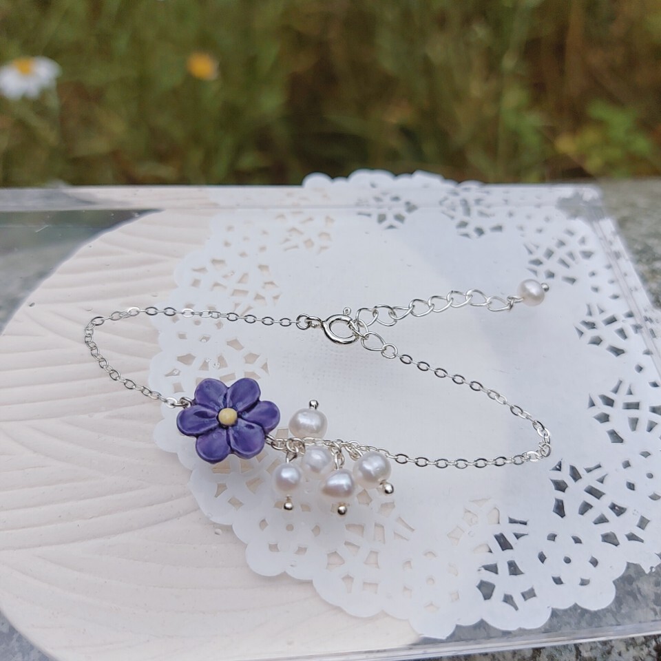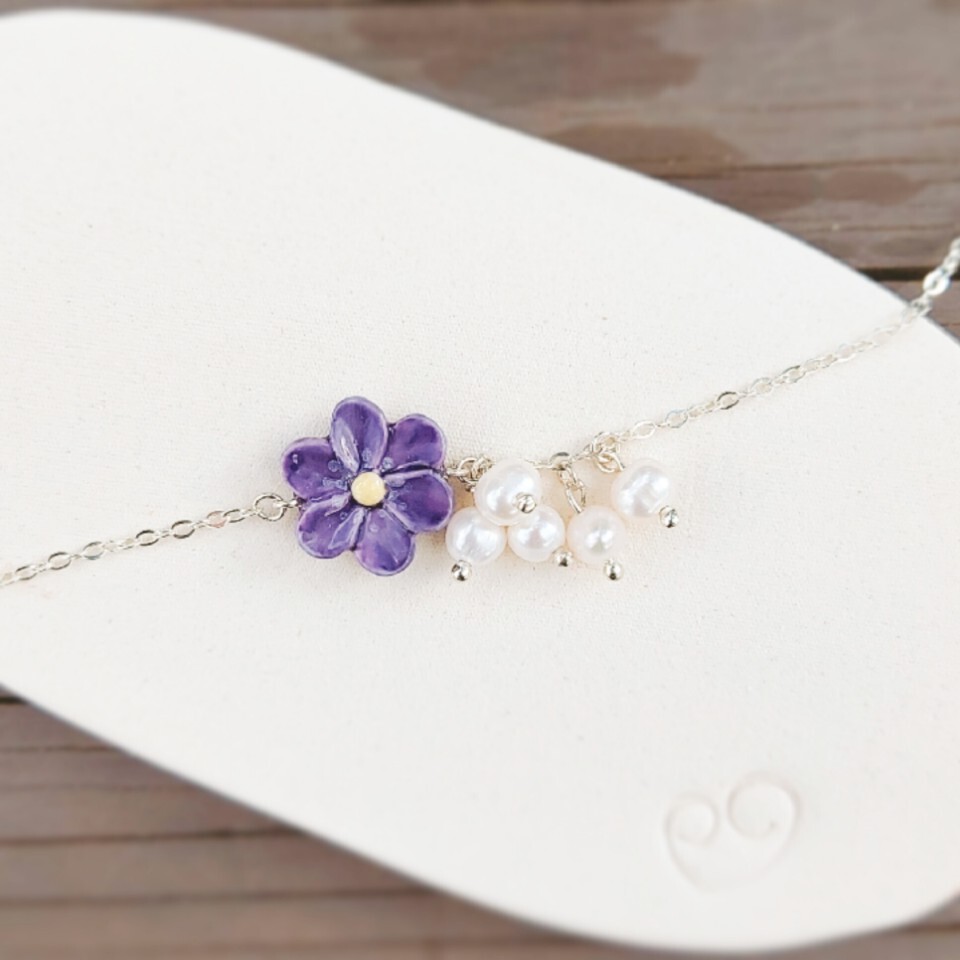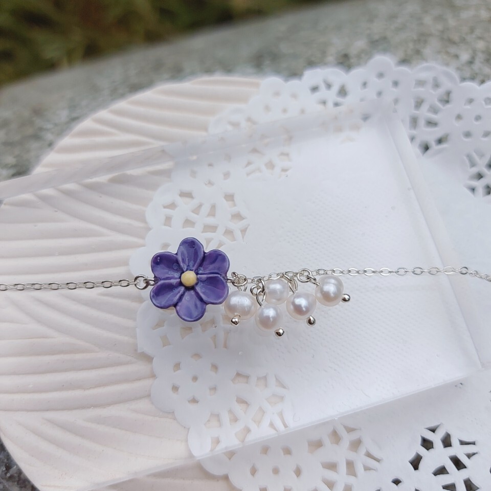 Handmade porcelain, 925 silver chain With freshwater pearl, Swarovski pearl (on extend-chain)